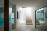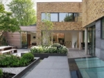 A home and work space of uncompromising quality tucked away behind what remained of the Victorian stables that had once occupied the site. Glazed walls wrap around two sides of a large courtyard garden. Materials are natural and durable; a granite wall stands tall in the double height entrance hall, a glass-sided bridge leads from the main house to the guest wing. The house is filled with daylight.